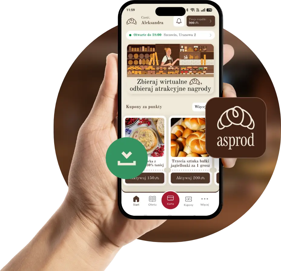Aplikacja Asprod Piekarnia-Cukiernia jest bezpłatnie dostępna w sklepach Google Play (dla urządzeń z systemem Android) oraz App Store (dla urządzeń z systemem iOS). W wyszukiwarce sklepu wpisz „Asprod Piekarnia-Cukiernia”, pobierz aplikację i zainstaluj ją na swoim urządzeniu. Następnie znajdź na ekranie telefonu ikonę rogalika „Asprod Piekarnia-Cukiernia”, kliknij ją i postępuj zgodnie z instrukcjami wyświetlanymi na ekranie.