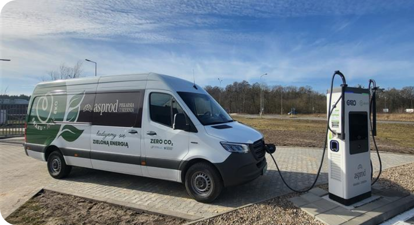 Korzystamy z ładowarek dla samochodów elektrycznych, które znajdują się przy siedzibie naszej firmy. Koszt ładowania dla naszych klientów obejmuje jedynie zużycie energii i eksploatację.