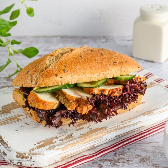Bułka z czarnuszką z dodatkiem sałaty, plastrów pieczonego kurczaka, ogórka zielonego oraz sosu duńskiego.