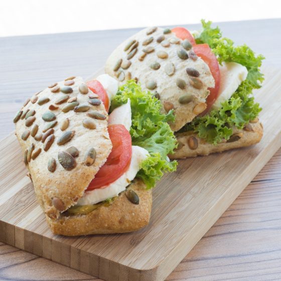 Bułka z dynią z dodatkiem sałaty, mozzarelli, pomidora oraz sosu bazyliowego.