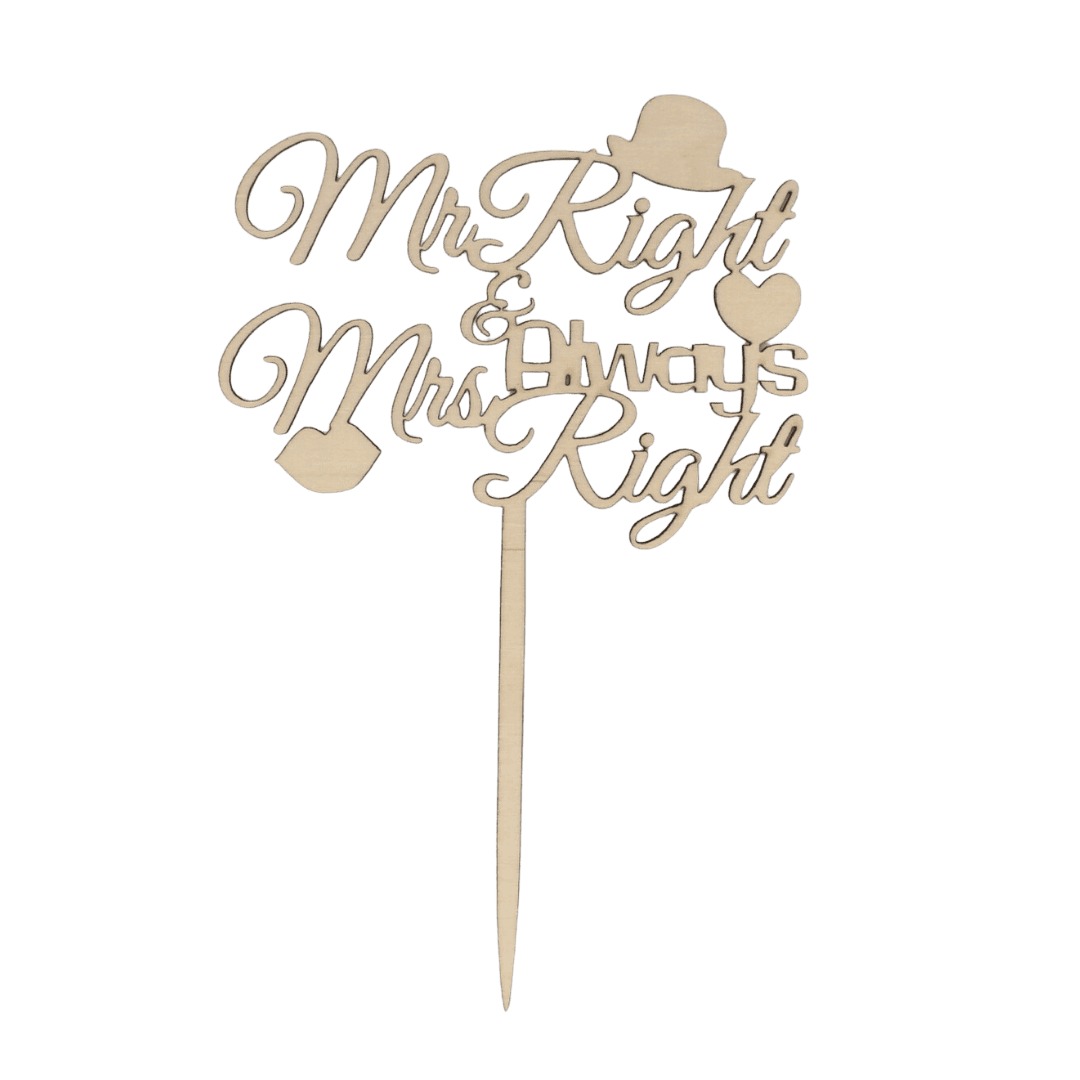 Drewniana ozdoba na tort z napisem „MR Right; Mrs Right” .