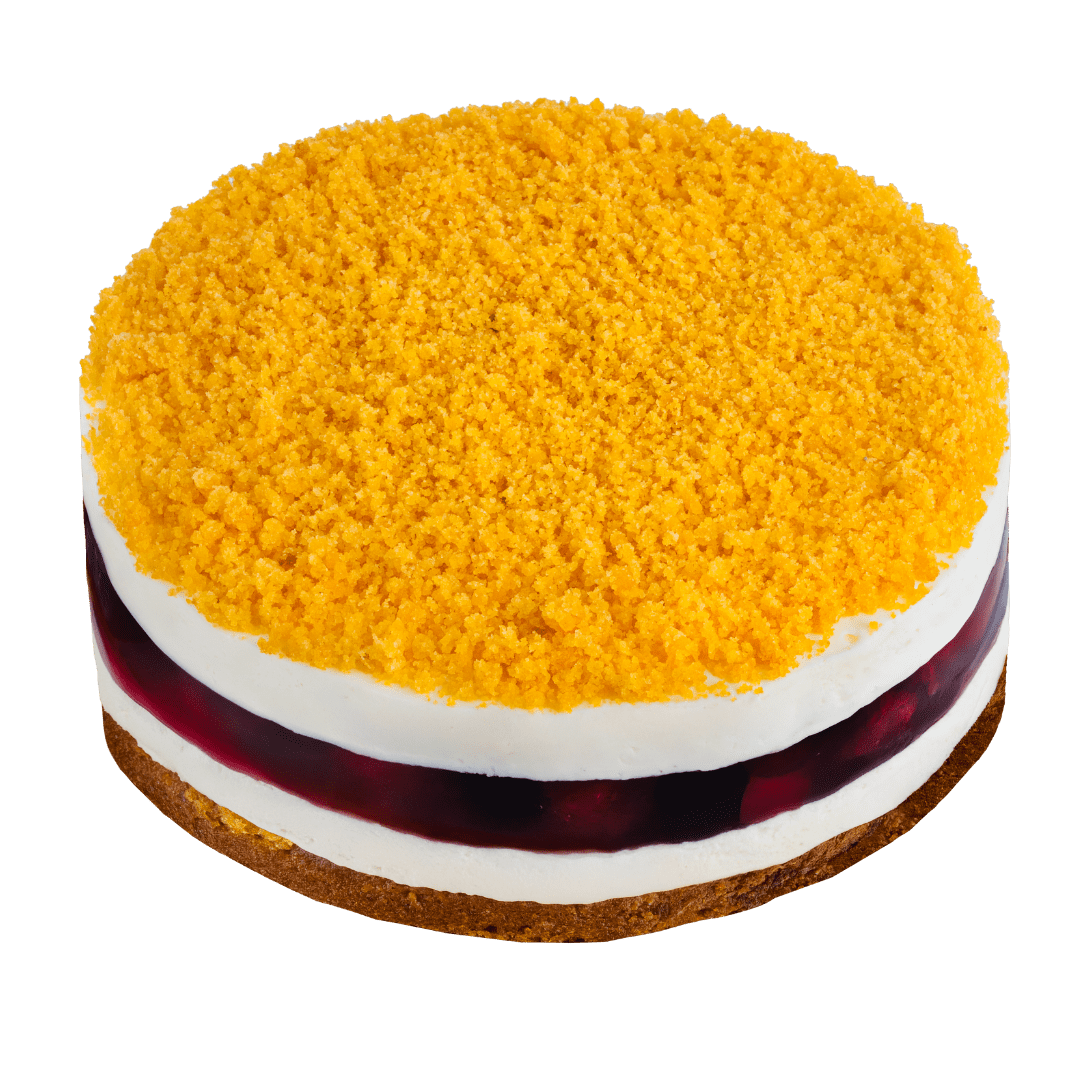 Jasny biszkopt o smaku pomarańczowym, przełożony bitą śmietaną oraz galaretką z borówkami i malinami. Udekorowany pokruszonym ciastem.
