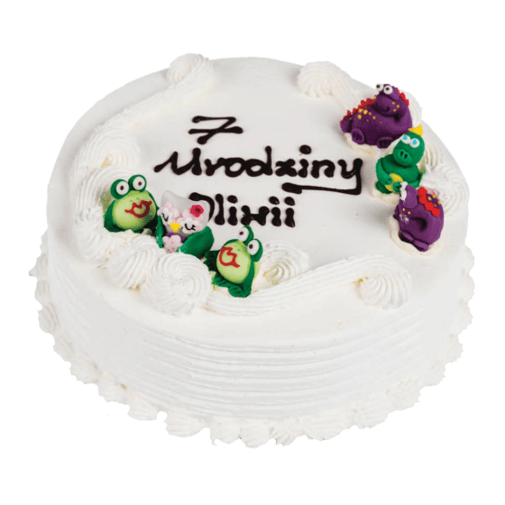 Tort na bazie bitej śmietany, udekorowany kremowymi rozetkami oraz figurkami potworków. Figurki potworków są dodatkowo płatne w cenie 24,59 zł/komplet oraz dołączone do samodzielnego umieszczenia na torcie. Napis na torcie wykonywany jest ręcznie za pomocą czekolady. Od 3 kg tort przygotowujemy w kształcie prostokąta.