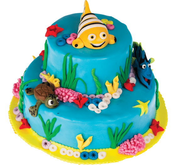 Tort w masie cukrowej, udekorowany ręcznie wymodelowanymi figurkami przedstawiającymi świat stworzeń wodnych. Minimalne zamówienie wynosi 3 kg, a maksymalna 6 kg.