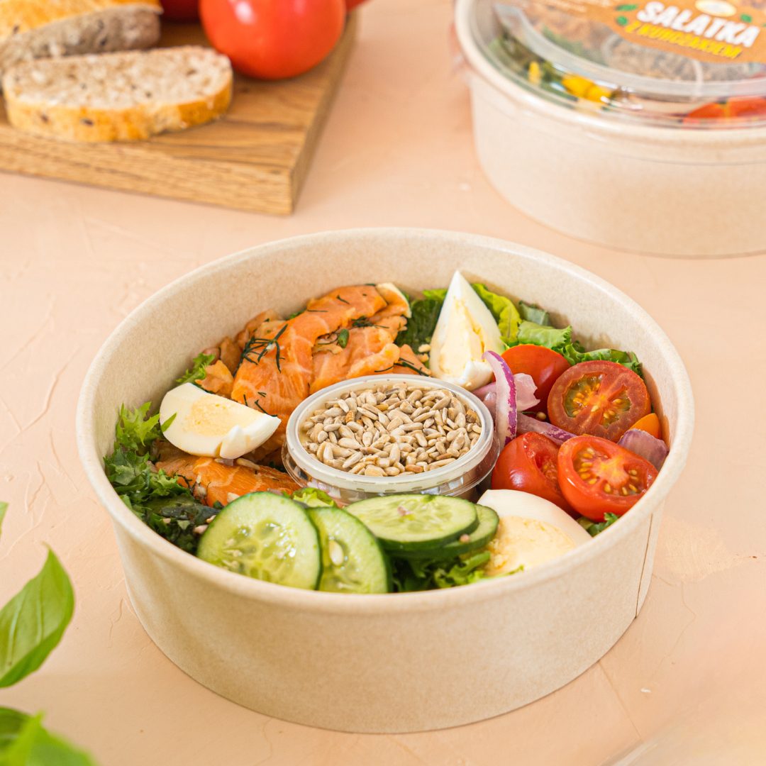 W skład sałatki z łososiem wchodzi: sałata (różne rodzaje), łosoś wędzony na zimno, jajko gotowane,  pomidory koktajlowe, ogórek, prażone pestki słonecznika, sos majonezowo-pomarańczowy.