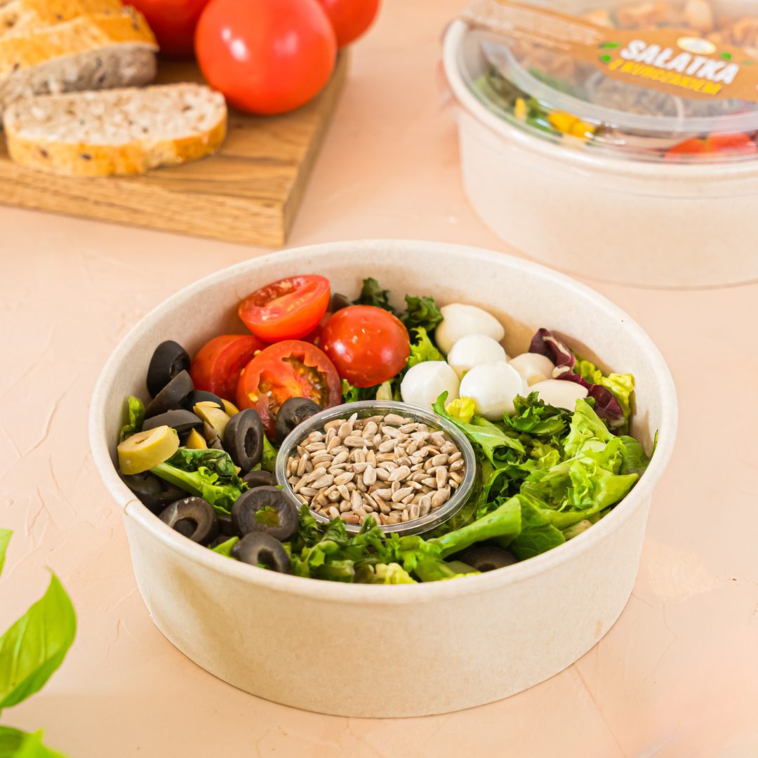 W skład sałatki z mozzarellą wchodzi: sałata (różne rodzaje), mozarella, pomidory koktajlowe, oliwki zielone i czarne, prażone pestki słonecznika, sos na bazie octu balsamicznego.