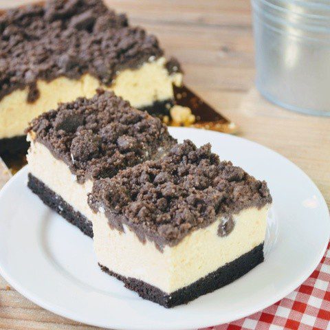 Puszysta masa serowa na ciemnym biszkopcie. Udekorowany kakaową kruszonką.
