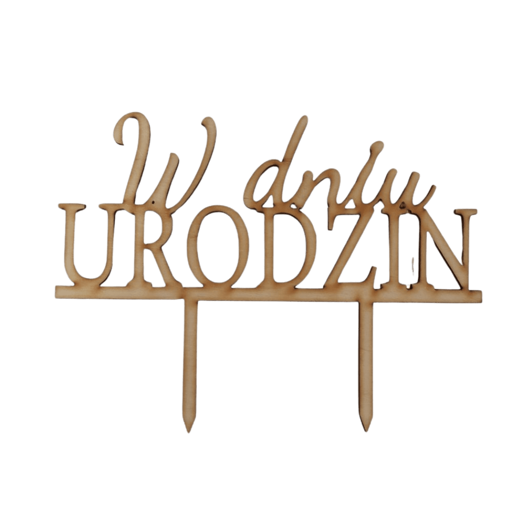 Drewniana ozdoba na tort z napisem „W dniu urodzin”.