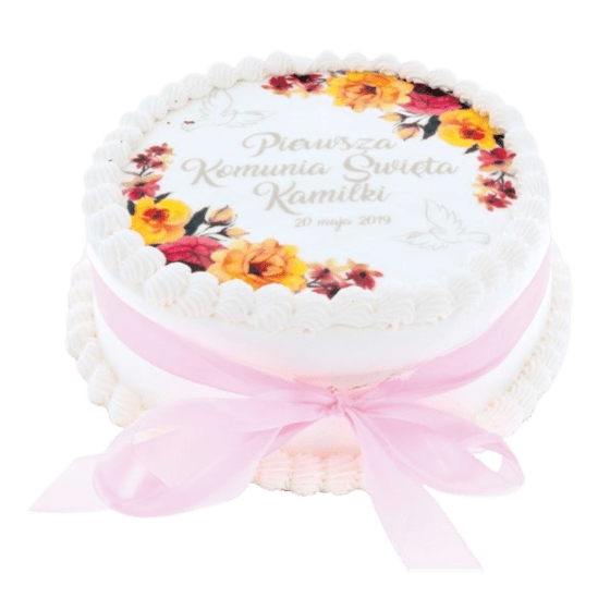 Tort na bazie bitej śmietany, udekorowany nakładką oraz wstążką.