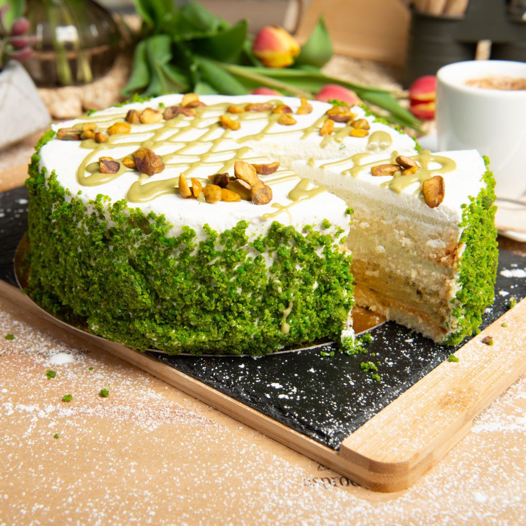 Jasne biszkopty przełożone bitą śmietaną o smaku pistacjowym oraz warstwą crunchu pistacjowego. Udekorowany pokruszonym ciastem i pistacjami.