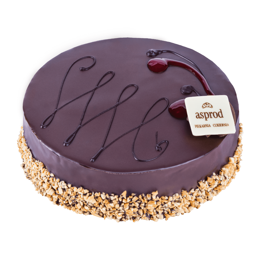 Ciemne biszkopty przełożone kremem russel z dodatkiem kakao, wiśni i rodzynek. Udekorowany polewą z dodatkiem czekolady oraz kawałkami orzechów arachidowych. Z alkoholem!